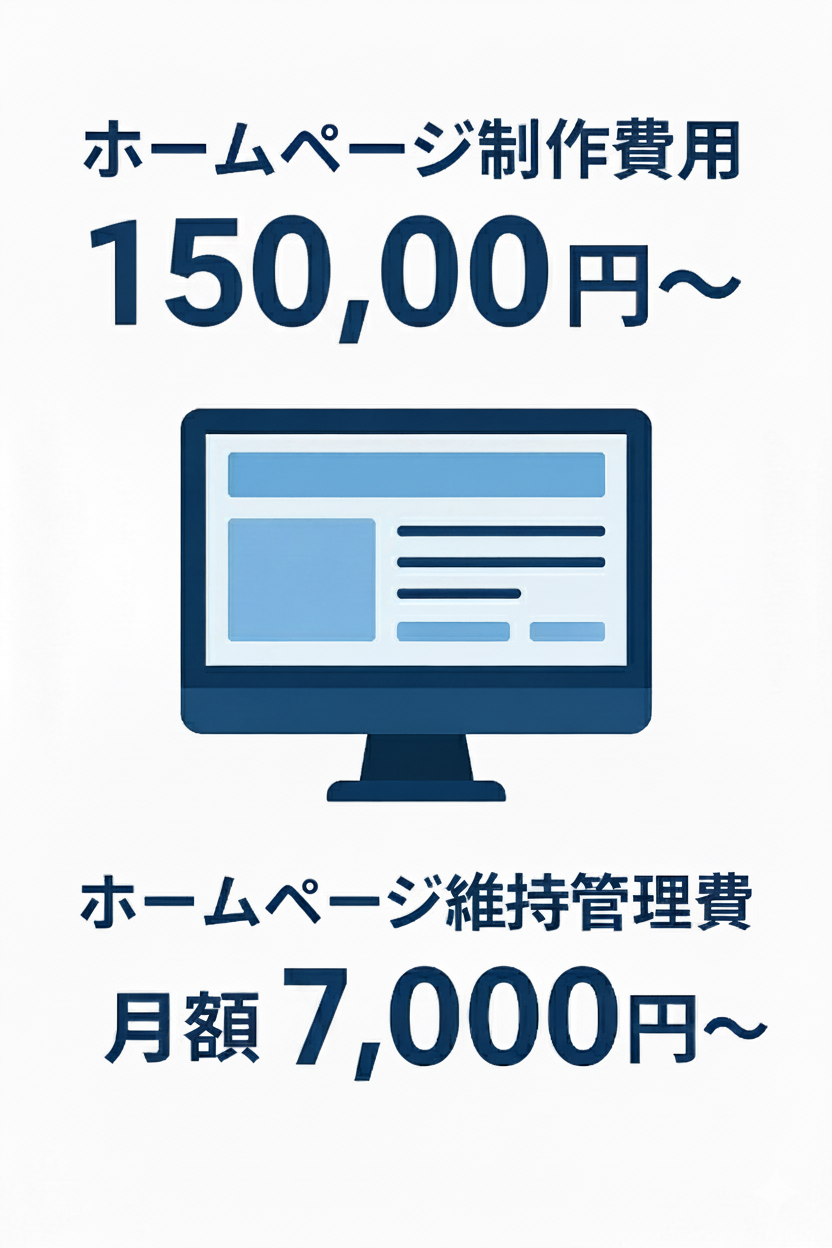 - ホームページ維持管理費 7,000円~(消費税別)(月に2回まで、写真の差し替え・お知らせ等の修正可能)